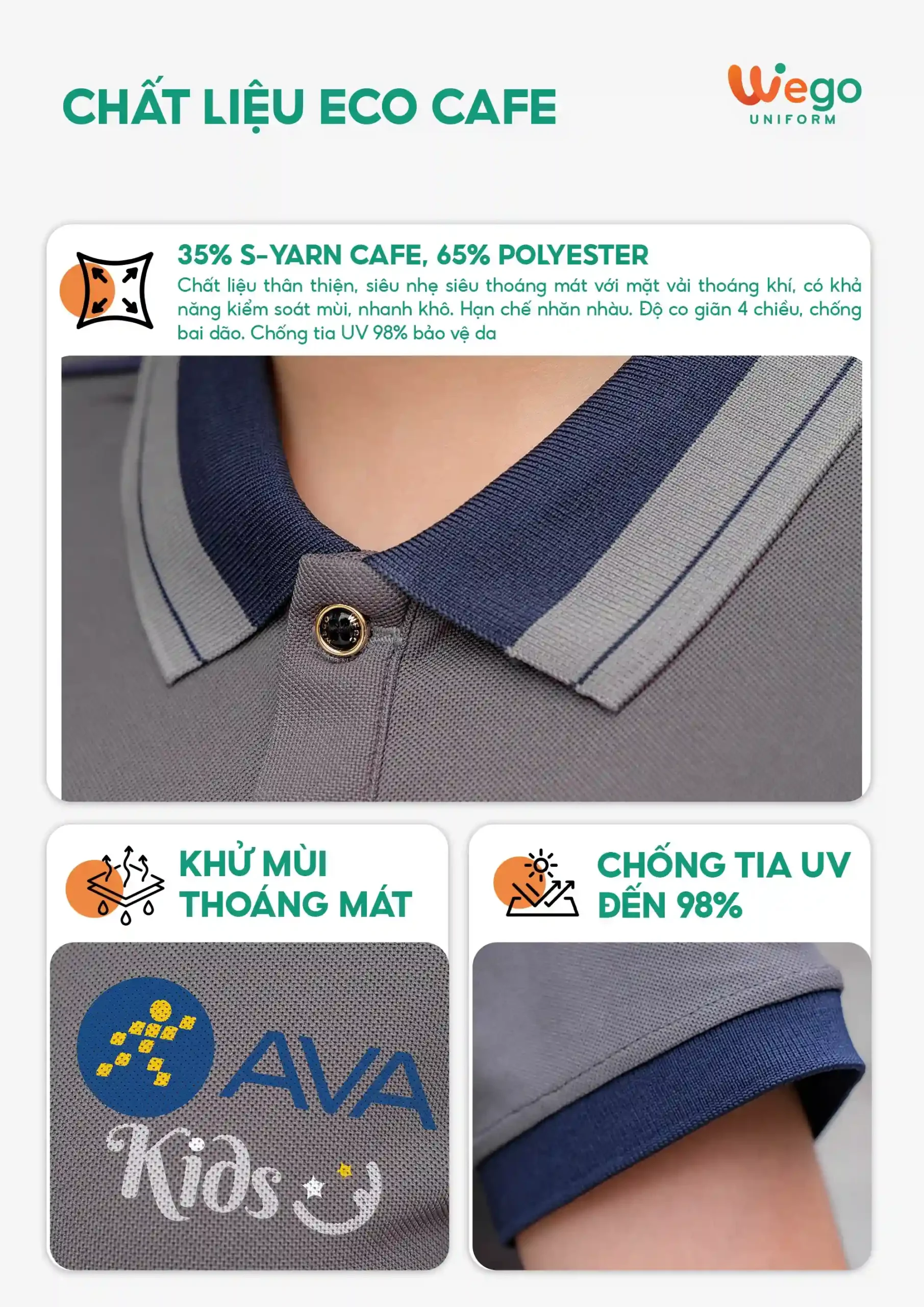 Áo đồng phục Minimal Polo: Màu ghi phối xám đậm lé 1 xanh đen 04 sử dụng chất liệu Eco Cafe – chất liệu loại vải thân thiện với môi trường, được làm từ 35% S-Cafe Yarn kết hợp với 65% polyester.
