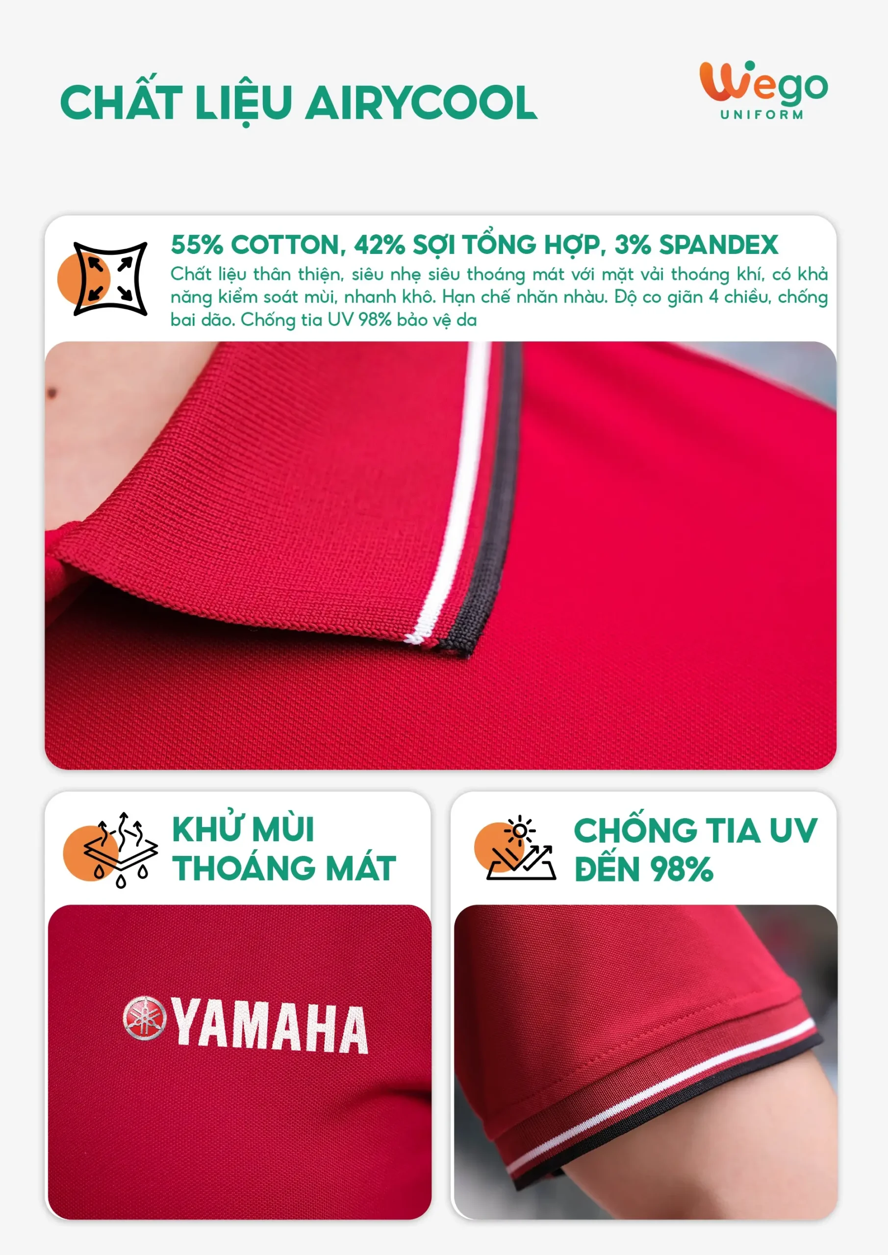 Áo đồng phục Minimal Polo: Màu đỏ đô 02 sử dụng chất liệu Airycool – Đây là loại vải đầu tiên trên thế giới được nghiên cứu trong phòng thí nghiệm với thành phần: 55% cotton, 42% Polyester, 3% Spandex.