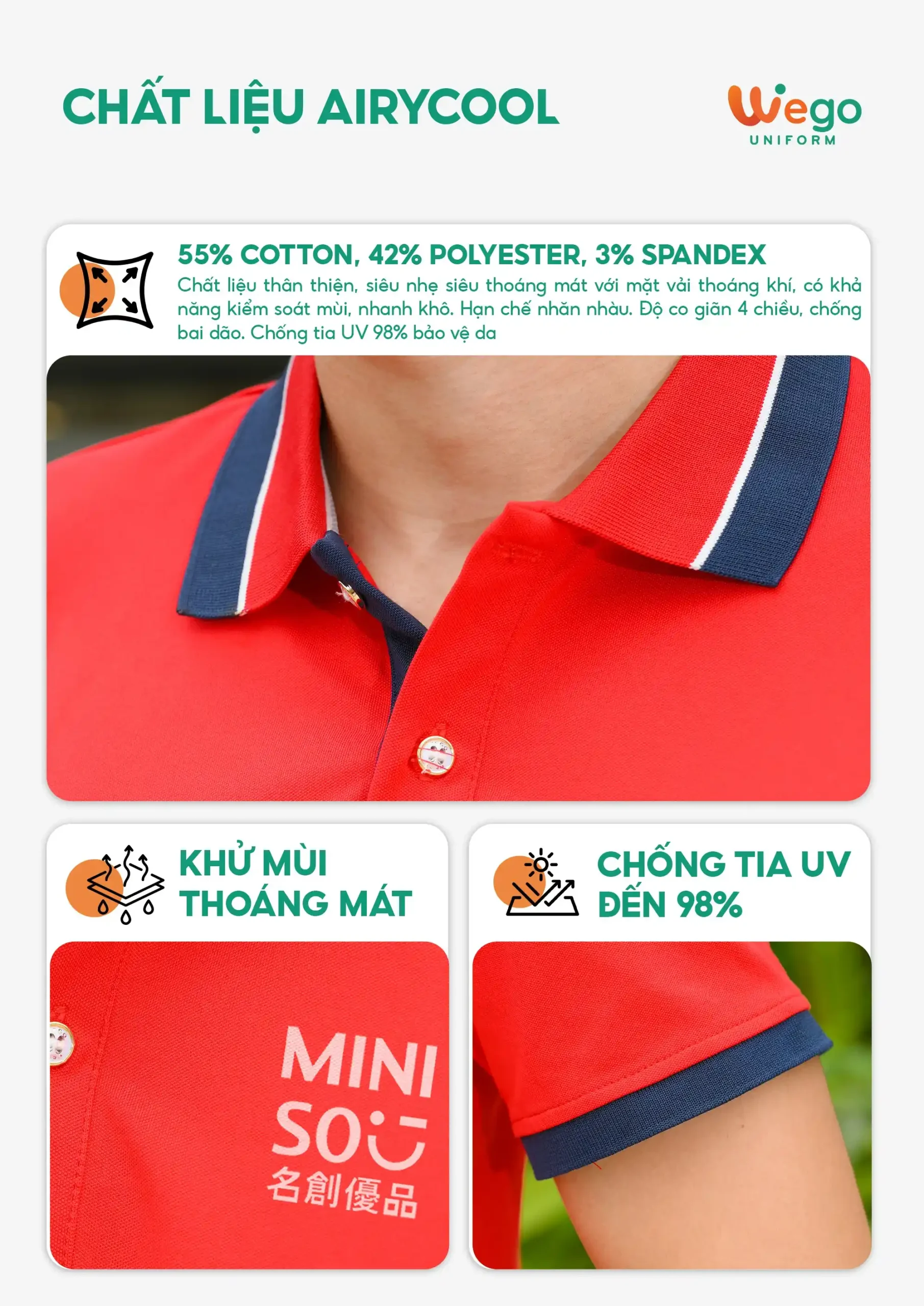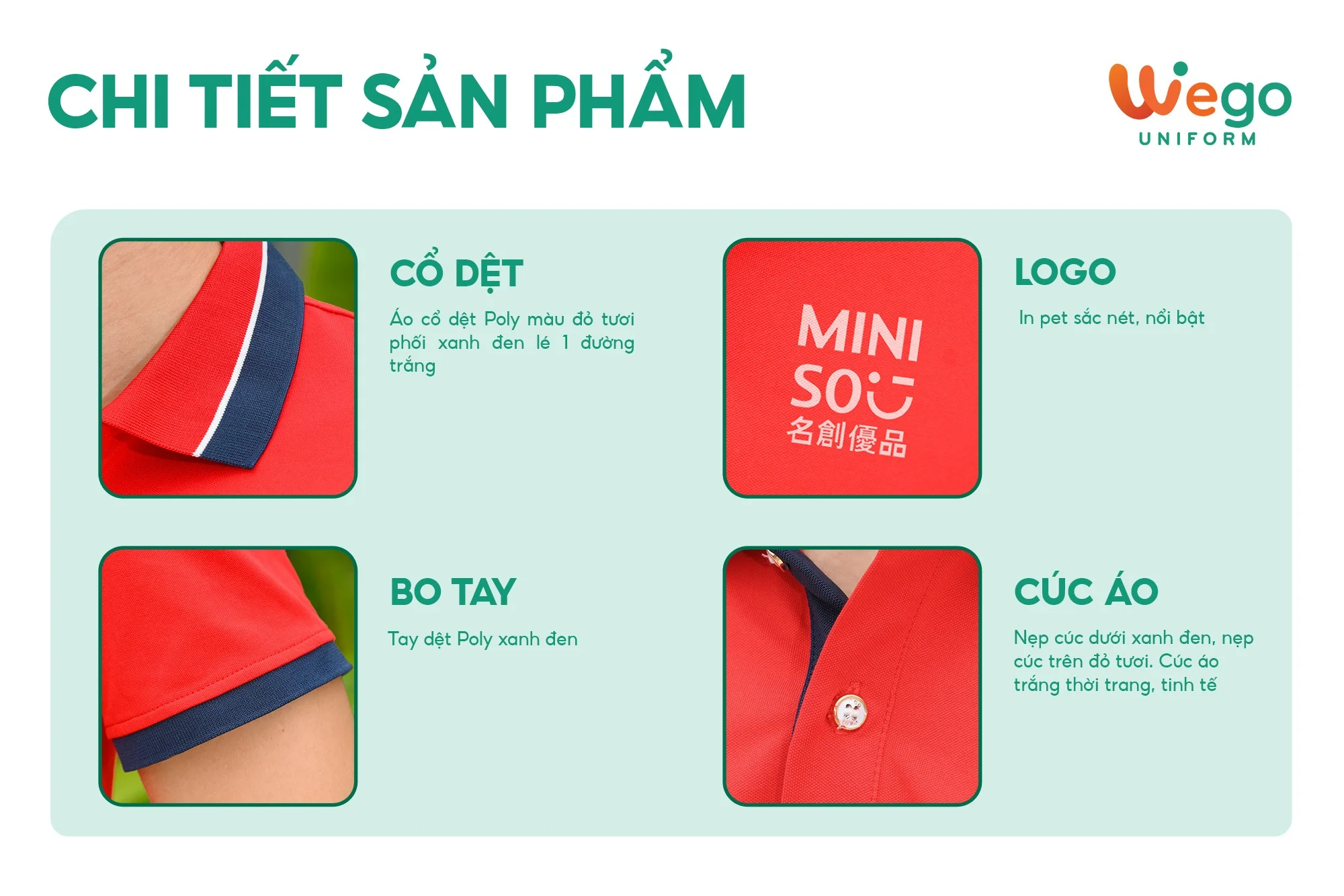 - Được thiết kế độc quyền bởi Wego Uniform, vừa nâng cao tính thời trang, vừa giúp nâng cao nhận diện thương hiệu