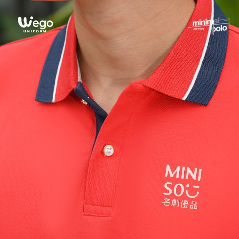 Áo đồng phục Minimal Polo: Màu đỏ tươi phối xanh đen lé 1 đường trắng 01 sử dụng chất liệu Airycool – Đây là loại vải đầu tiên trên thế giới được nghiên cứu trong phòng thí nghiệm với thành phần: 55% cotton, 42% Polyester, 3% Spandex.