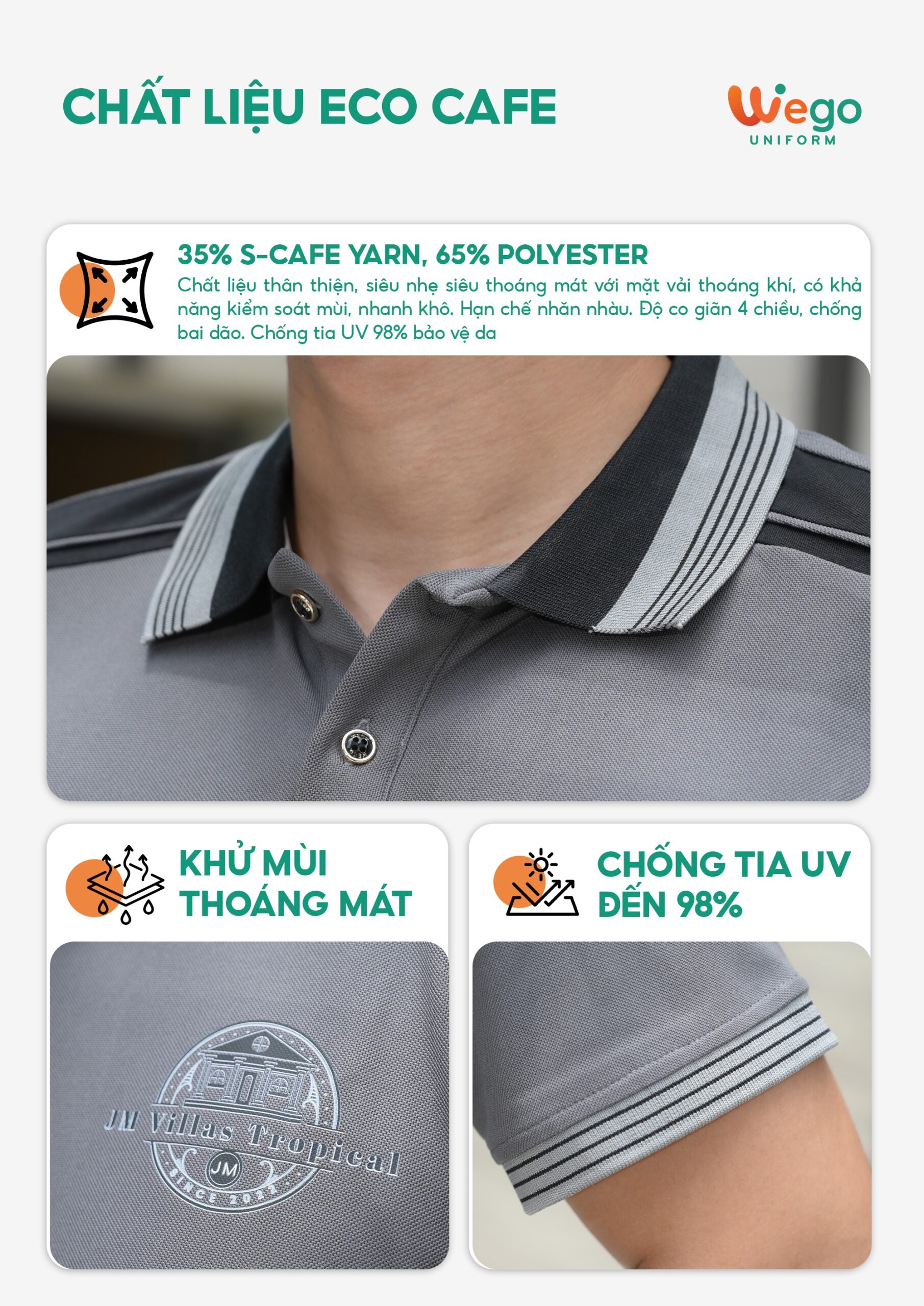 Áo đồng phục Minimal Polo: Màu ghi có lé 4 đường màu đen 06 sử dụng chất liệu Eco Cafe – chất liệu loại vải thân thiện với môi trường, được làm từ 35% S-Cafe Yarn kết hợp với 65% polyester.