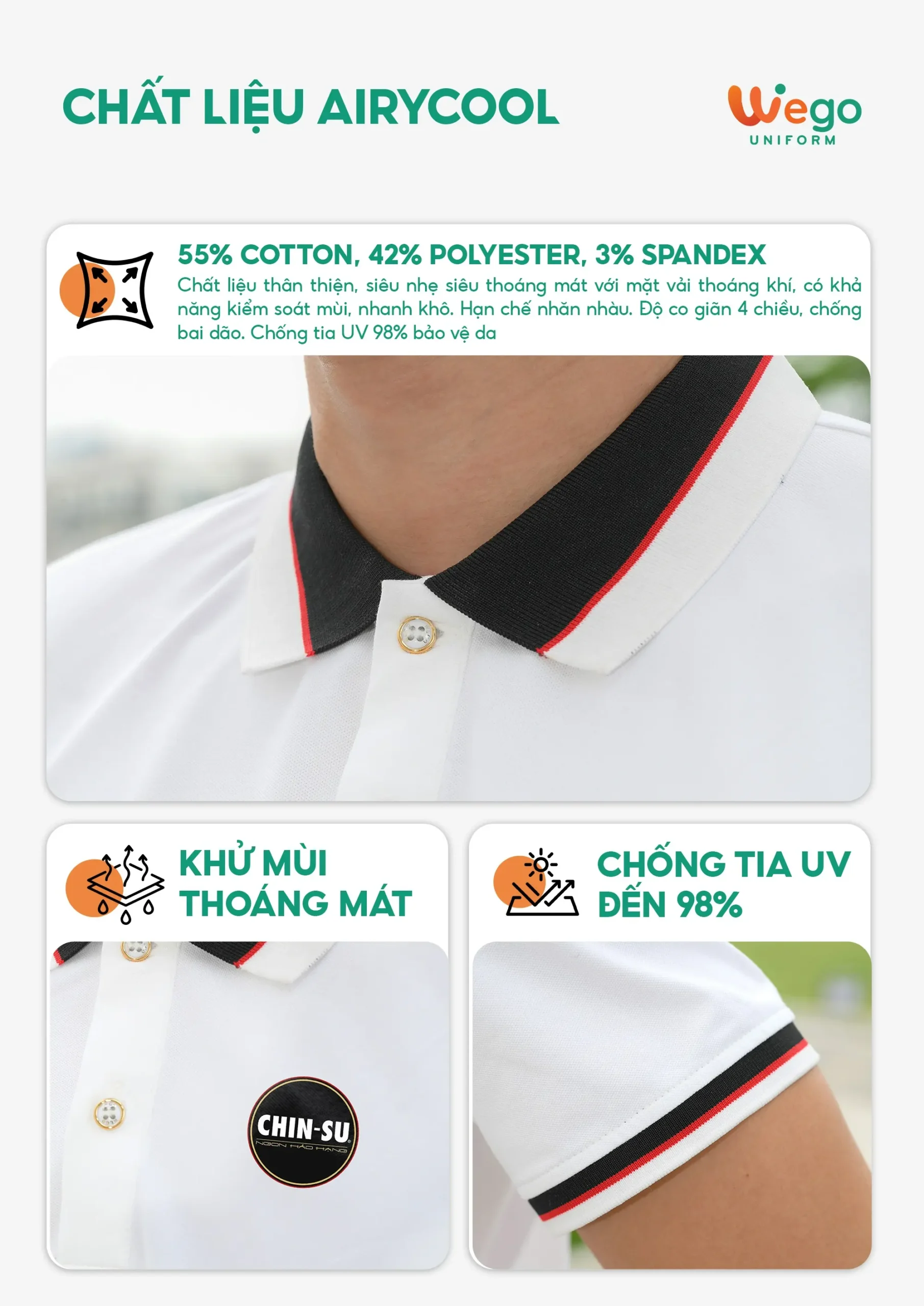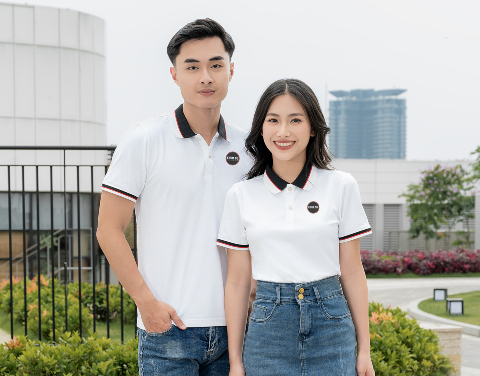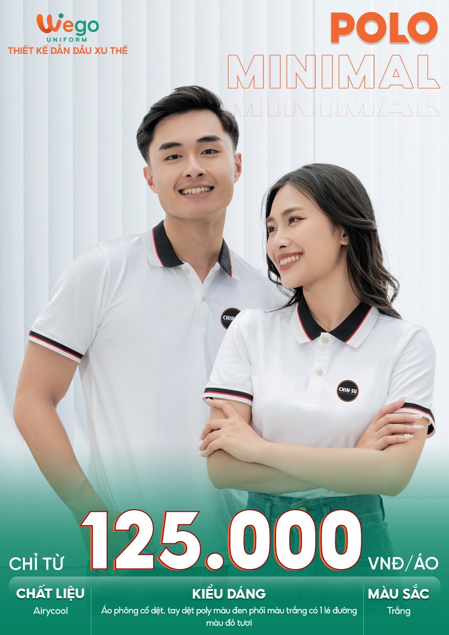 Áo đồng phục Minimal Polo: Màu trắng có 1 lé đường màu đỏ tươi 04 sử dụng chất liệu Airycool – Đây là loại vải đầu tiên trên thế giới được nghiên cứu trong phòng thí nghiệm với thành phần: 55% cotton, 42% Polyester, 3% Spandex.