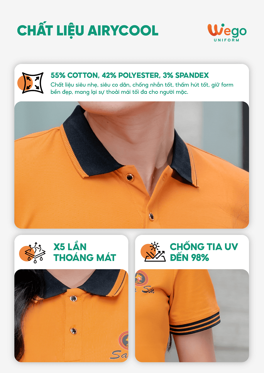 Chính vì vậy, áo đồng phục Wego luôn có độ bền cao, khả năng co giãn và thoáng khí tốt. Từ đó mang lại sự thoải mái tối đa cho người mặc, ngay cả trong thời tiết nắng nóng hay những môi trường làm việc đòi hỏi vận động nhiều hoặc trong thời gian dài.