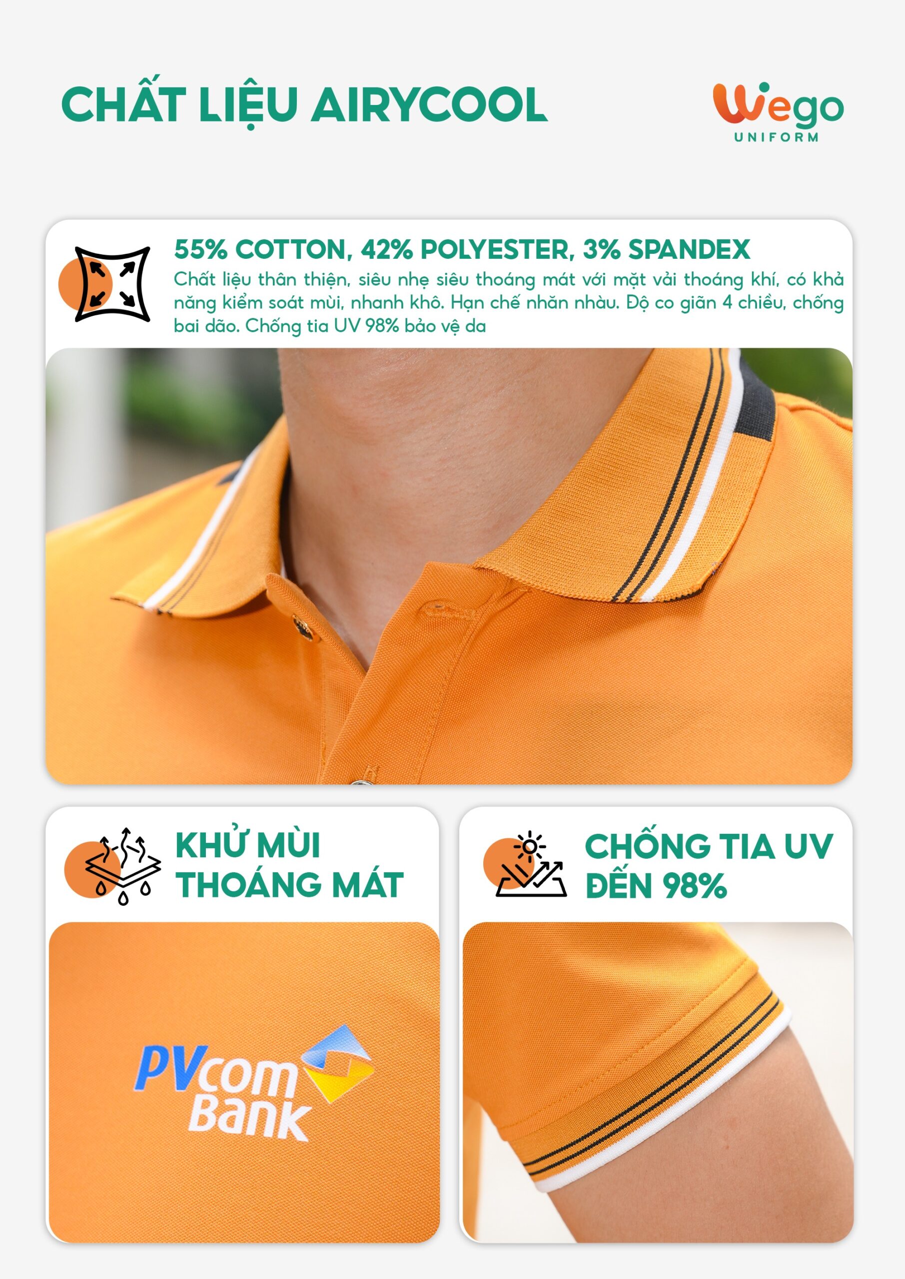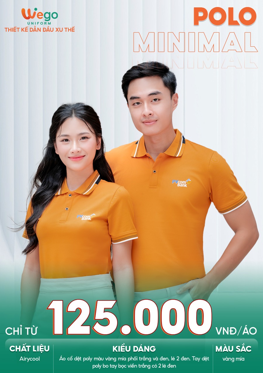 Áo đồng phục Minimal Polo: Màu vàng mía phối trắng, đen 03 sử dụng chất liệu Airycool – Đây là loại vải đầu tiên trên thế giới được nghiên cứu trong phòng thí nghiệm với thành phần: 55% cotton, 42% Polyester, 3% Spandex.