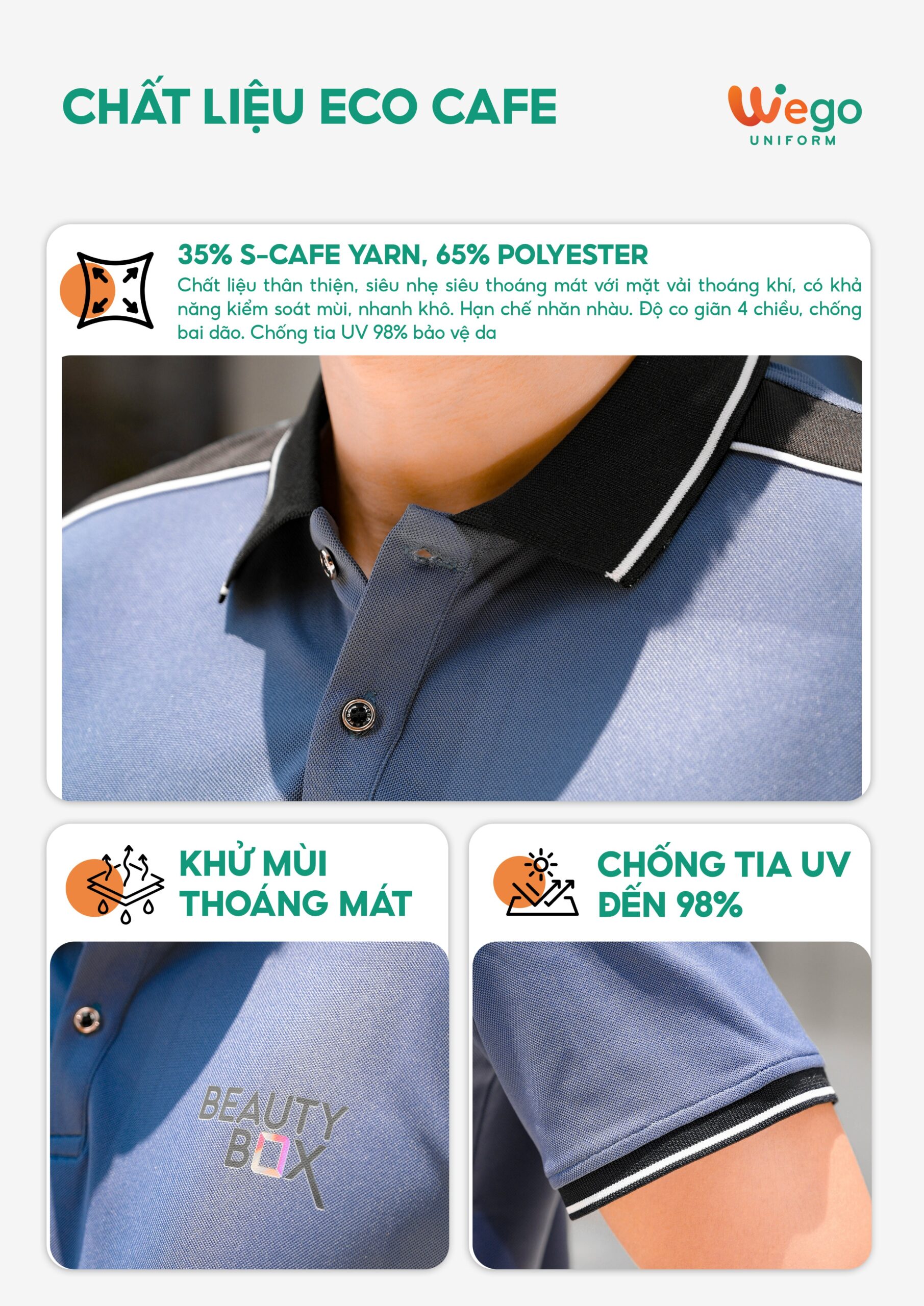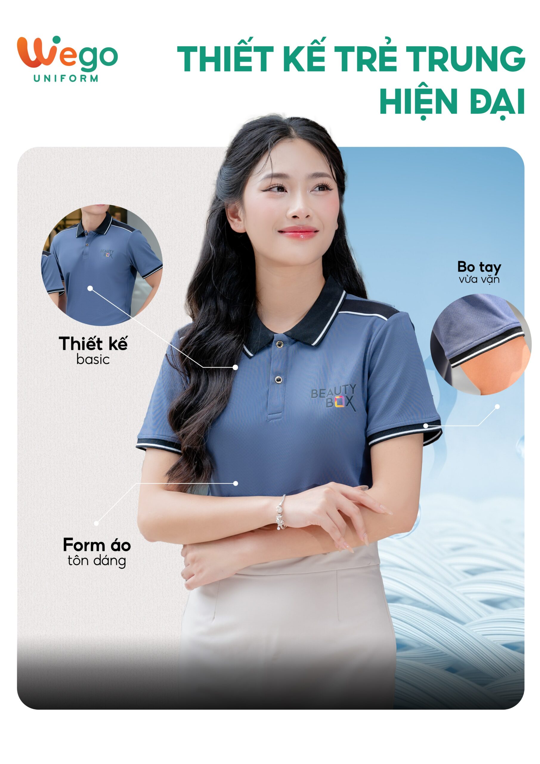 • Được thiết kế độc quyền bởi Wego Uniform, vừa nâng cao tính thời trang, vừa giúp nâng cao nhận diện thương hiệu