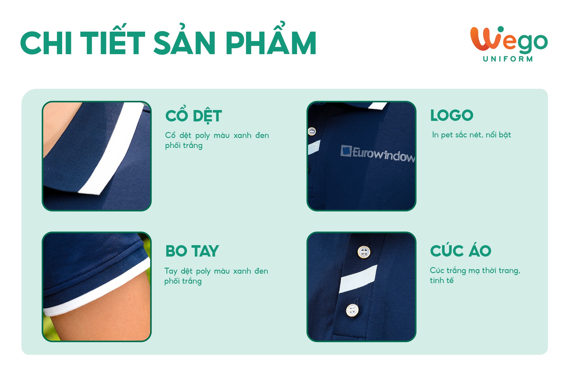 - Được thiết kế độc quyền bởi Wego Uniform, vừa nâng cao tính thời trang, vừa giúp nâng cao nhận diện thương hiệu