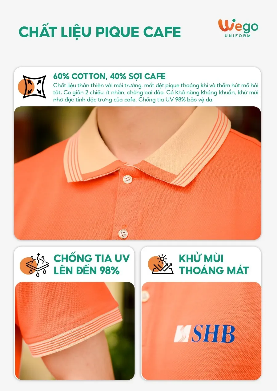 Áo đồng phục Pique Cafe: Màu vàng mía cổ dệt vàng mía có 1 lé trắng nhỏ sử dụng chất liệu Pique Cafe – Đây là loại vải độc quyền tại Wego Uniform với thành phần: 60% Cotton, 40% sợi Cafe.