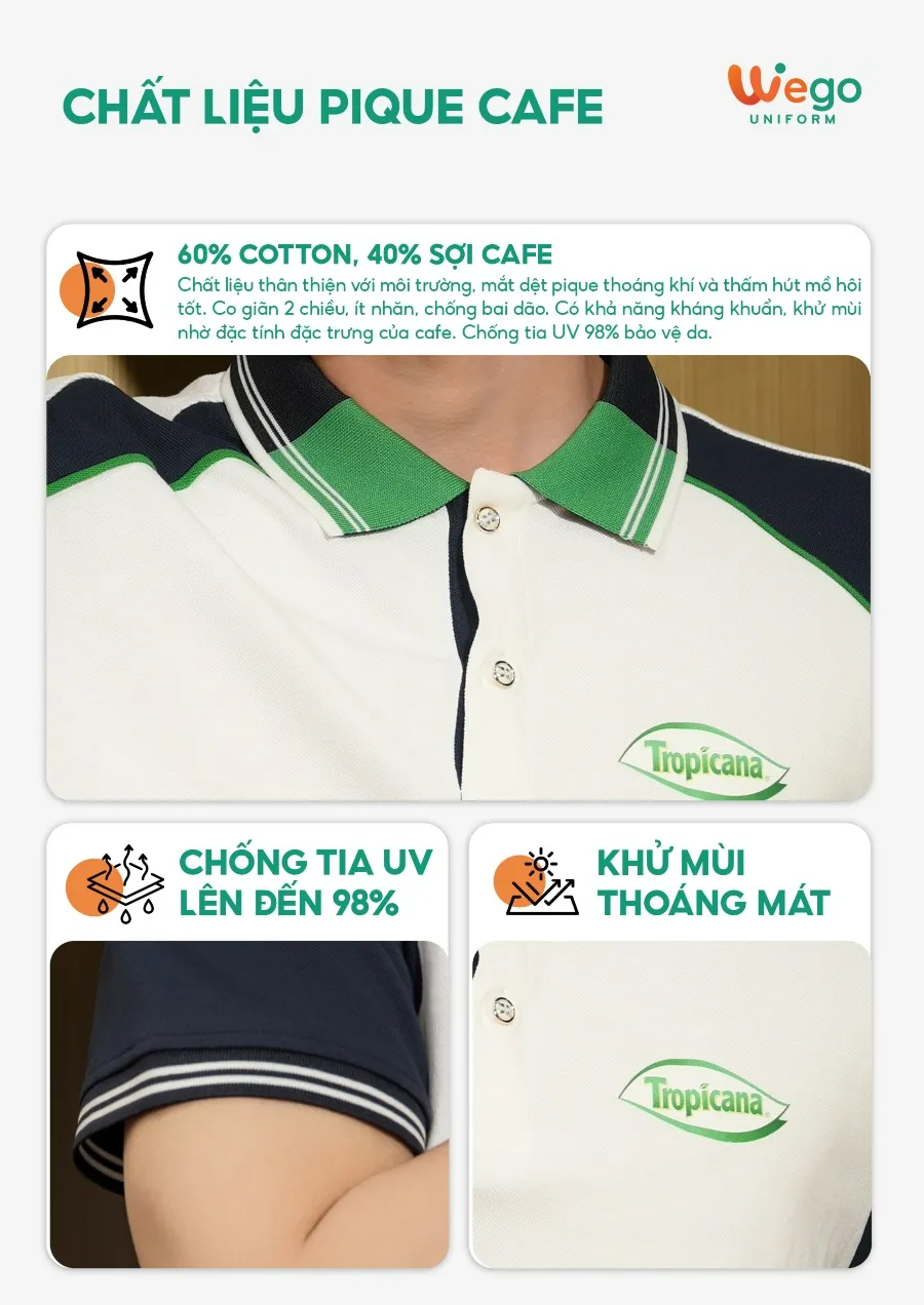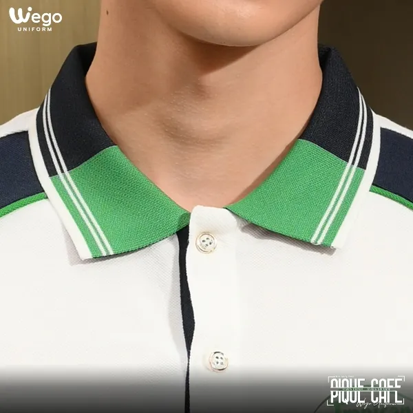 Áo đồng phục Pique Cafe: Áo thun phông đồng phục Pique Cafe: Màu trắng phối xanh đen, lé màu xanh két sử dụng chất liệu Pique Cafe – Đây là loại vải độc quyền tại Wego Uniform với thành phần: 60% Cotton, 40% sợi Cafe.