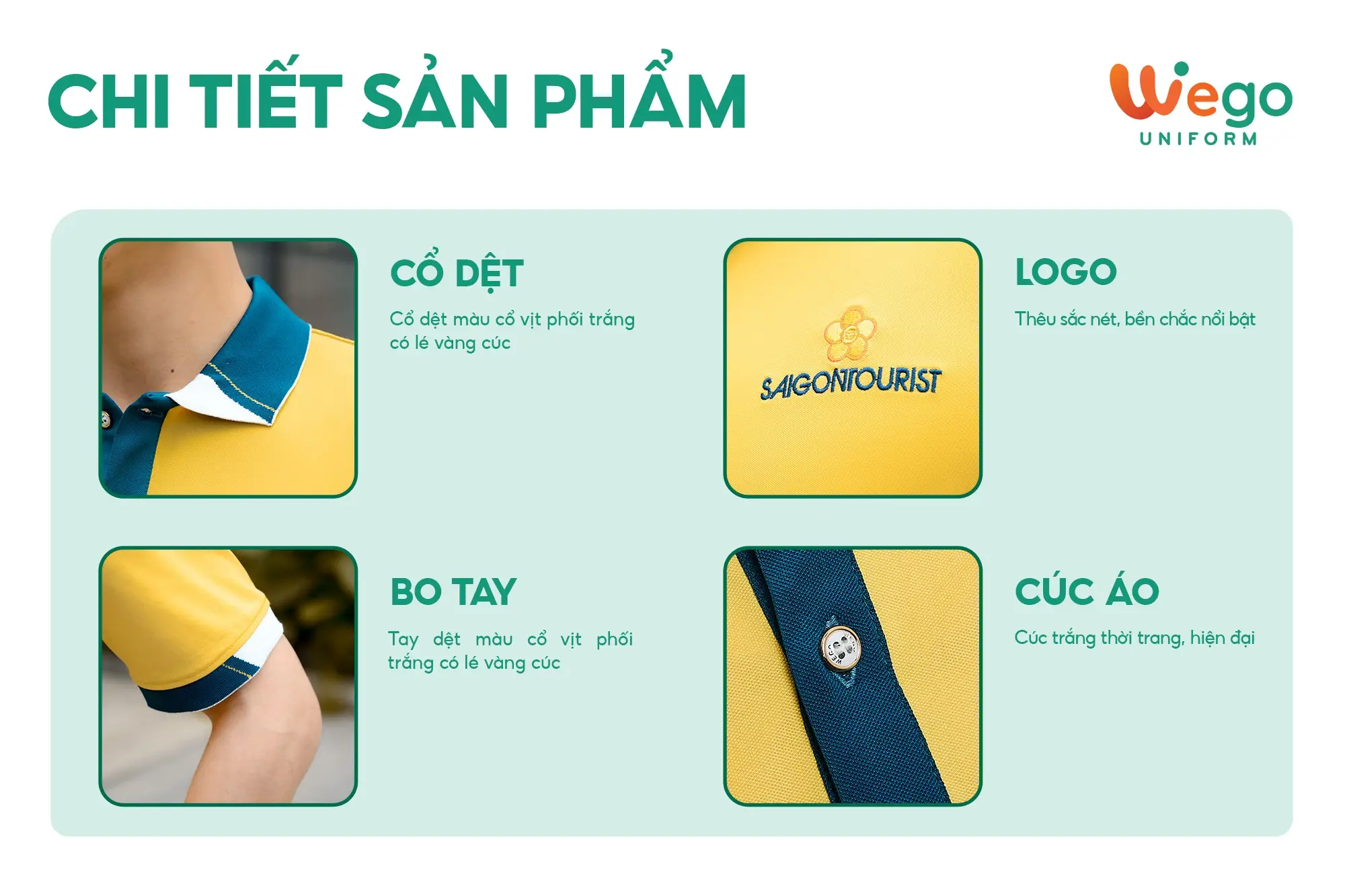 - Được thiết kế độc quyền bởi Wego Uniform, vừa nâng cao tính thời trang, vừa giúp nâng cao nhận diện thương hiệu