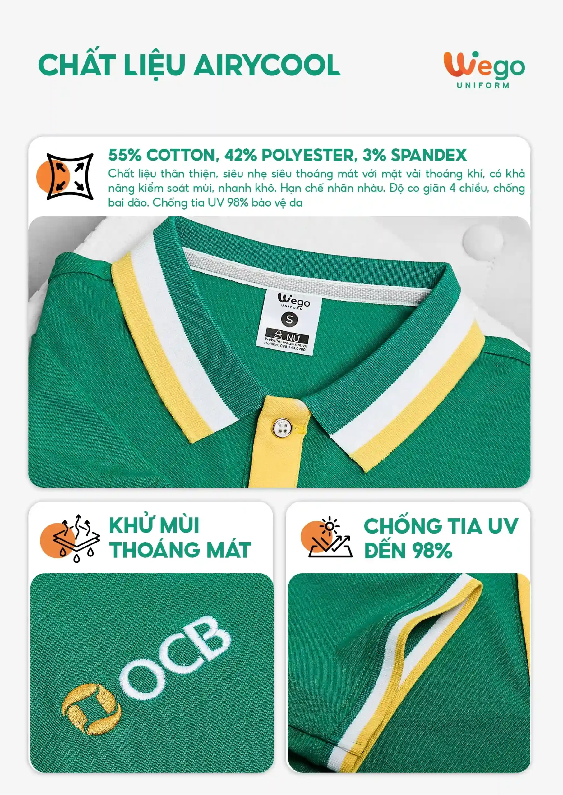 Chính vì vậy, áo đồng phục Wego luôn có độ bền cao, khả năng co giãn và thoáng khí tốt. Từ đó mang lại sự thoải mái tối đa cho người mặc, ngay cả trong thời tiết nắng nóng hay những môi trường làm việc đòi hỏi vận động nhiều hoặc trong thời gian dài.