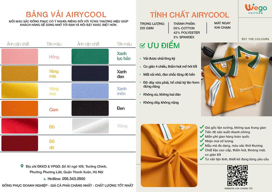 Vải Airycool được coi là chất liệu mới, với công nghệ dệt vải vô cùng hiện đại; Kết cấu vải siêu mịn, tỉ mỉ, chắc chắn với nhiều ưu điểm nổi bật như: