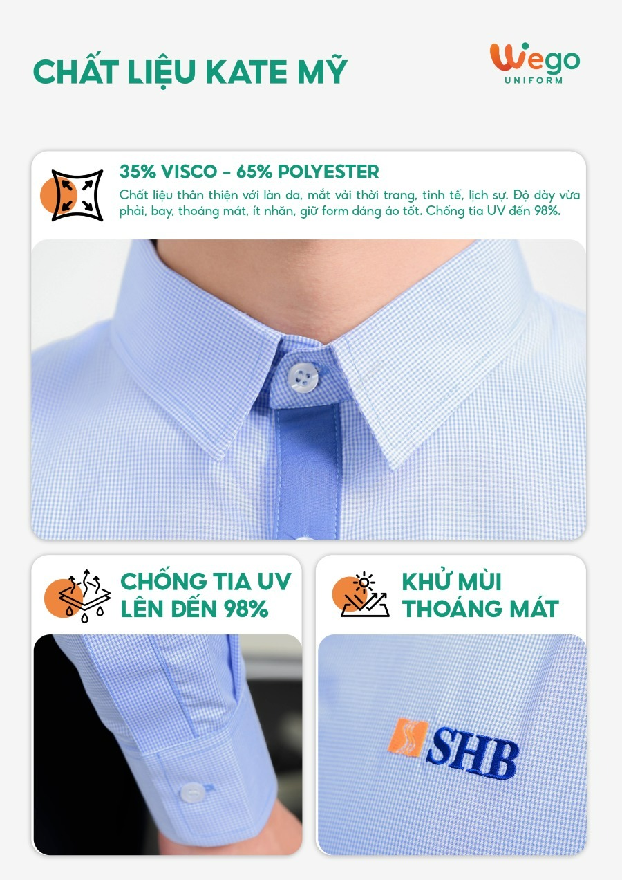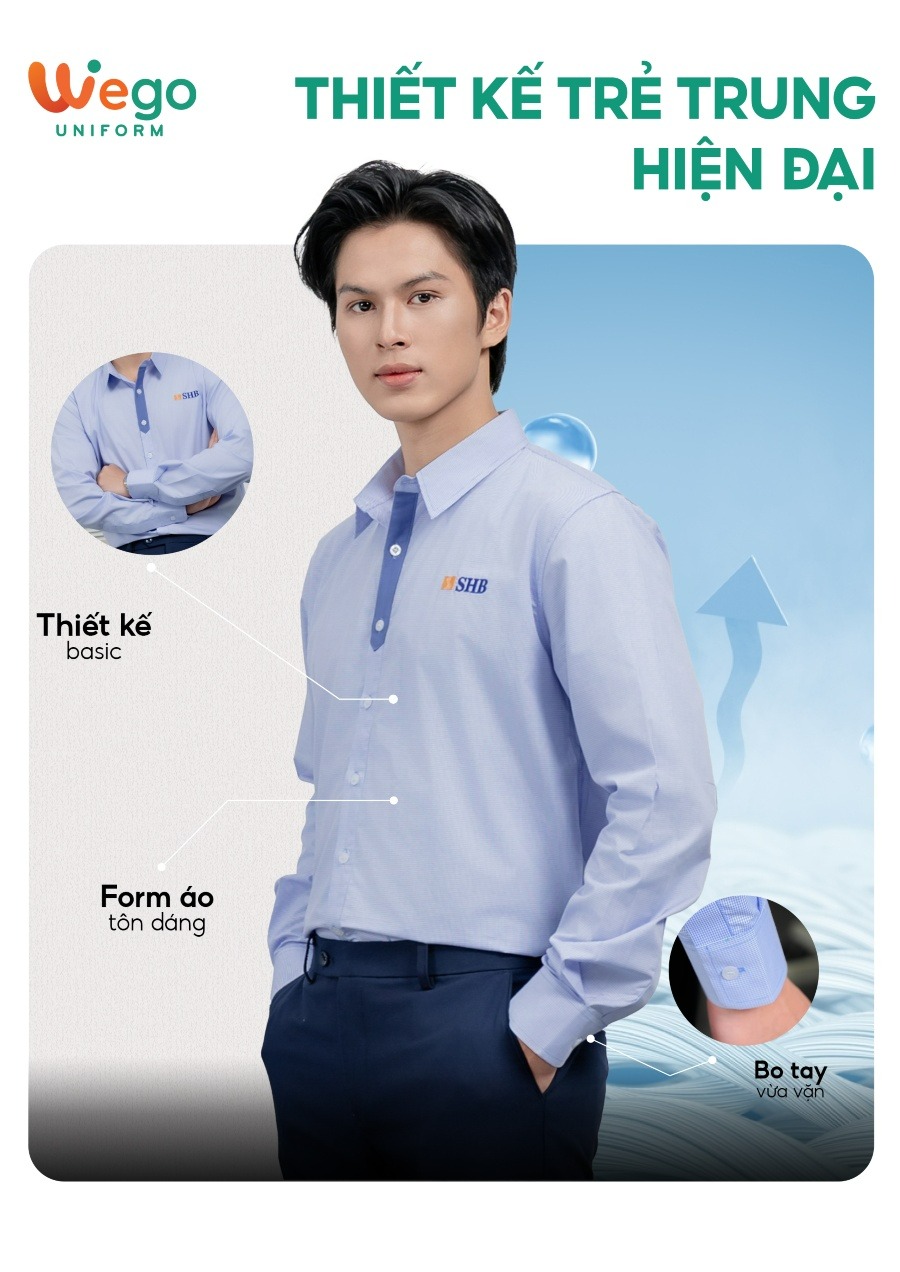 Mẫu đồng phục sơ mi được thiết kế theo logo thương hiệu SHB, sử dụng các đường kẻ phối xanh làm chủ đạo.