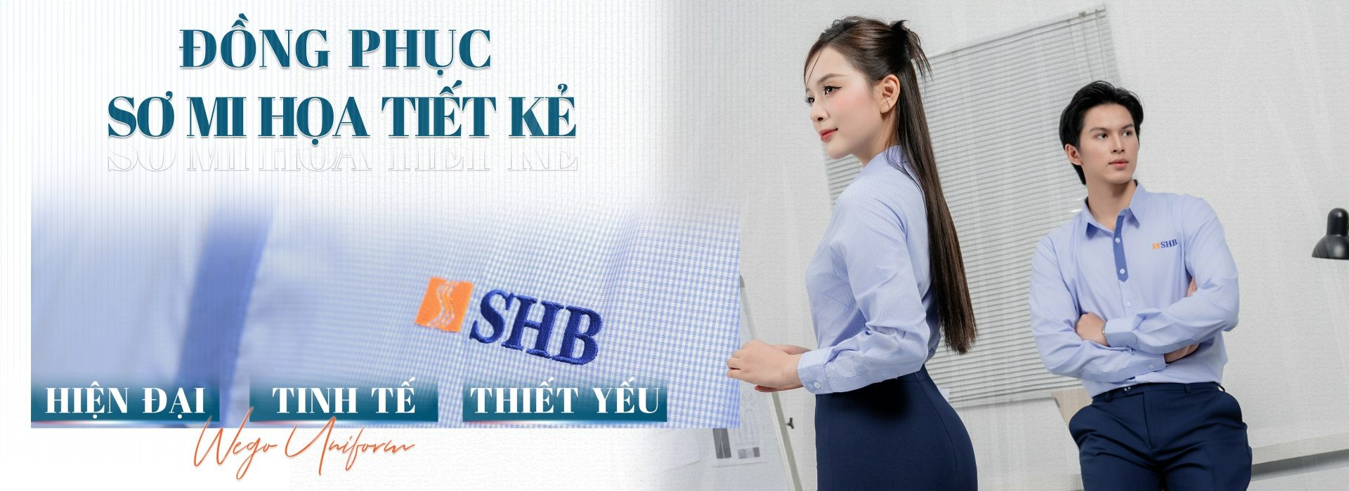 Mẫu đồng phục sơ mi được thiết kế theo logo thương hiệu SHB, sử dụng các đường kẻ phối xanh làm chủ đạo.