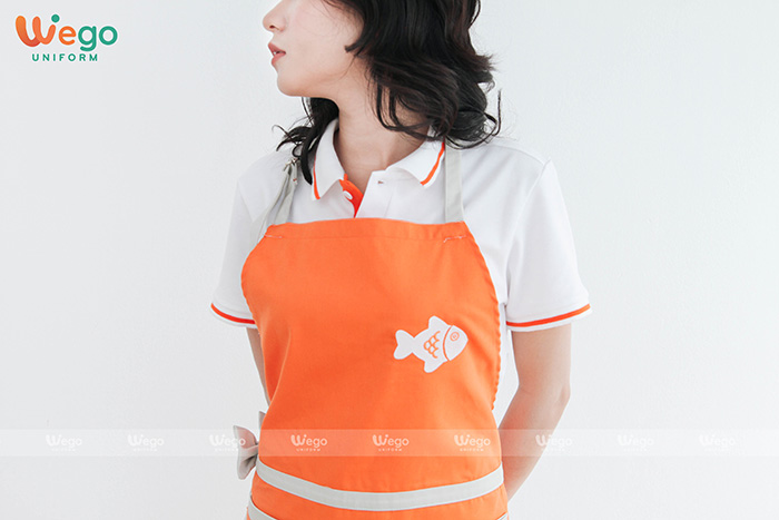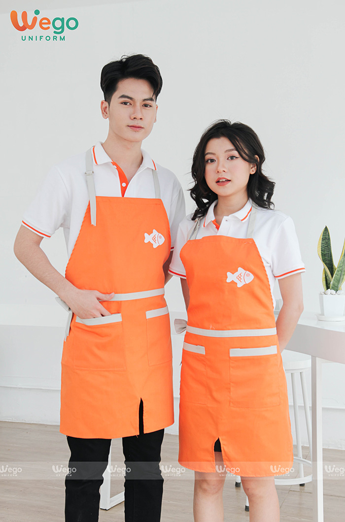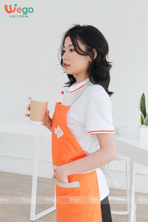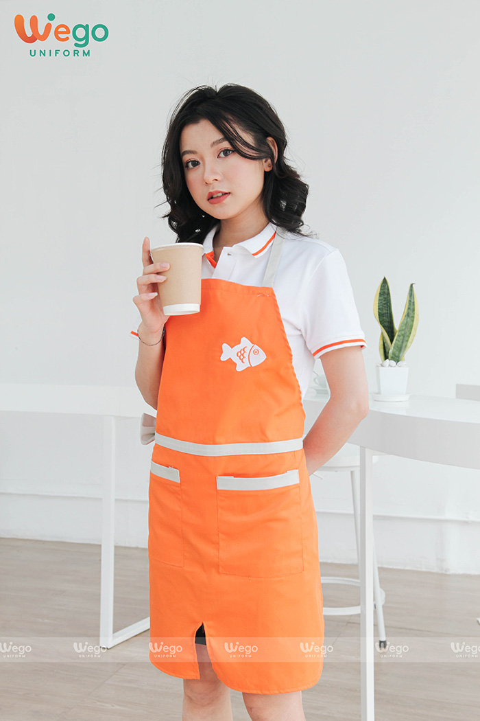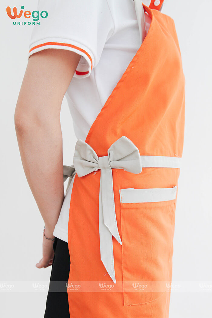 Chi tiết sản xuất: Tạp dề toàn thân màu cam, dây buộc cổ buộc cổ màu ghi cùng đai ghi trắng tạo điểm nhấn. Logo trước ngực giúp quảng bá thương hiệu.